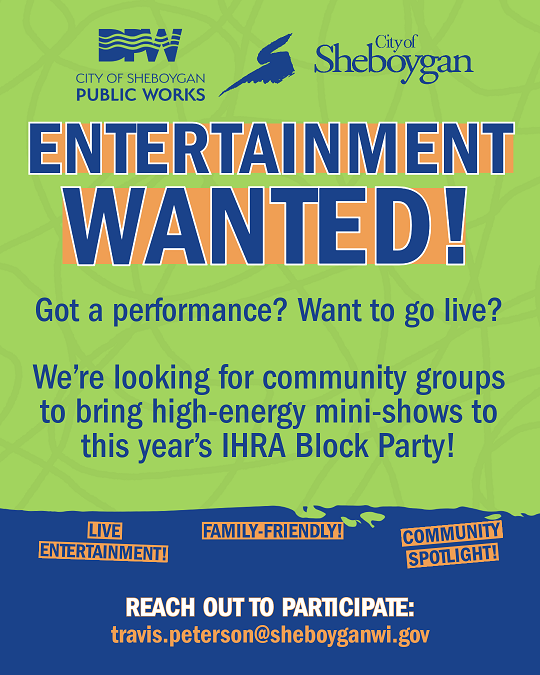 The City of Sheboygan is seeking local groups or organizations interested in providing short entertainment pieces for the IHRA (International Hot Rod Association) Boat Race Block Party on Friday, August 7.