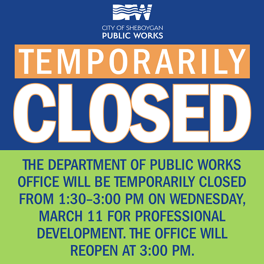The Department of Public Works Office, located at 2026 New Jersey Avenue, will be temporarily closed for business on Wednesday, March 11, 2026, from 1:30-3:00 PM. The office will reopen at 3:00 PM.