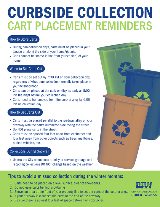 - Carts can be placed at the curb or alley as early as 5:00 p.m. the night before your collection day.