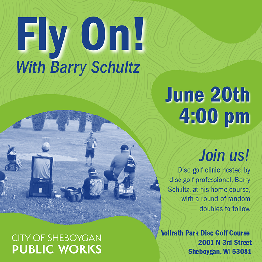 Join us at 4:00 p.m. on June 20th at Vollrath Park disc golf course for Fly On!, a disc golf clinic hosted by disc golf professional, Barry Schultz at his home course, with a round of random doubles to follow!