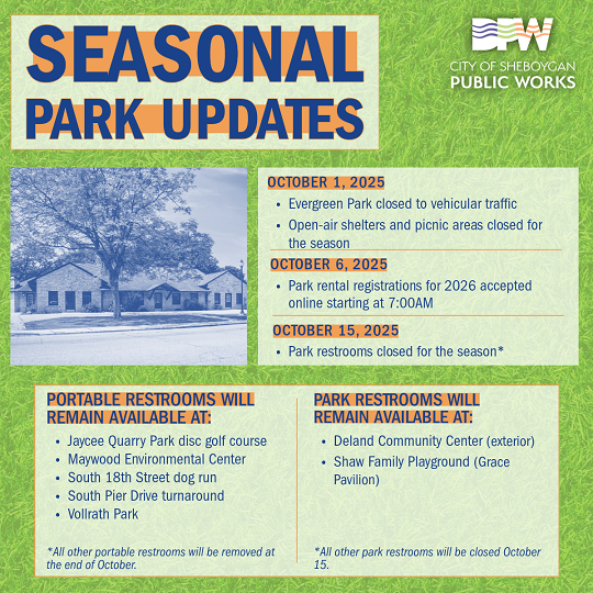 Beginning October 15, 2025, most City of Sheboygan park restrooms will close for the season. Park restrooms will remain available on the exterior portion of the Deland Community Center and at Grace Pavilion at the Shaw Family Playground.