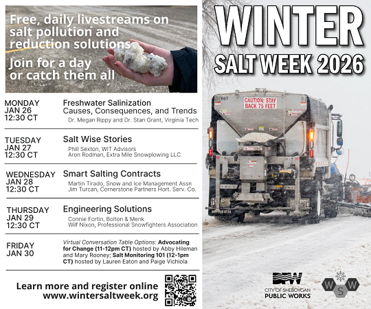 The City of Sheboygan Department of Public Works is proud to join communities across the country in supporting Winter Salt Week, held during the last week of January. This annual event raises awareness about the impacts of winter salt use and promotes solutions to reduce salt pollution.